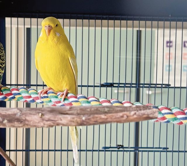 Twello- Dit is Aurora, een prachtige vrouwelijke grasparkiet met een schitterend geel verenkleed dat meteen in het oog springt. Ze is een vrolijke en nieuwsgierige vogel die graag alles om zich heen observeert vanaf haar favoriete zitplekje.