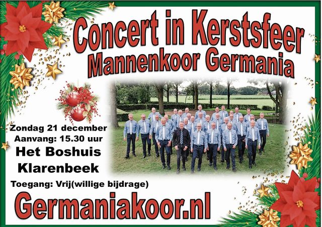 Klarenbeek- Op zondag 21 december 2025 verzorgt Mannenkoor Germania uit Heeten een sfeervol Concert in Kerstsfeer in het Boshuis te Klarenbeek.