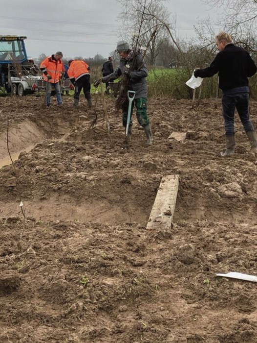 Het viel de vrijwilligers niet mee om zich staande te houden op de natgeregende gladde klei en een enkeling ging tot en met de enkel ‘onder’. Voor de groei is klei natuurlijk een mooi voedzame bodem. Met schoenen/laarzen liepen we redelijk schoon naar de haag in het voorste weiland aan de Middendijk, waar de in 2021 geplante elzenhaag de droogte van 2022 en 2023 niet goed heeft doorstaan, maar deze is nu weer aangevuld op de lege plekken met 33 struiken en 17 elzen.