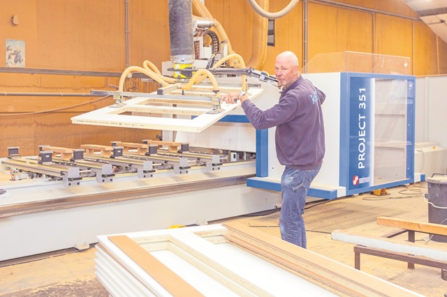 In 40 jaar tijd heeft hij veel zien veranderen binnen het familiebedrijf, zo komen er tegenwoordig geen boomstammen meer binnen, maar kant-en-klare platen. Ook werkt Sjonnie inmiddels in een moderne werkplaats met een CNC-machine. “Dat doe ik samen met een jongere collega. Hij is meer van de computers, ik meer van het handwerk. Samen komen we heel ver”, vult hij aan terwijl hij met een takel een deur van één van de CNC’s tilt.