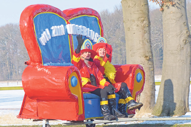 WILP-ACHTERHOEK- De bontgekleurde praalwagens en vrolijk uitgedoste loopgroepen verzamelden zich zondagochtend op de Kneuterstraat en Soerhuislaan in Posterenk. Dit was het verzamelpunt voor alle deelnemers aan de 40ste optocht tussen Wilp en Wilp-Achterhoek. De stoet steekt fel af in een besneeuwd en winters landschap. Nadat alle wagens door de jury van de optochtcommissie zijn bekeken komt rond 12.30 het sein dat de optocht van start kan. Inmiddels hebben zich langs de route weer duizenden mensen verzameld die het feest van dichtbij willen meemaken. De organisatie was wederom in vertrouwde handen van de optochtcommissie Pampus en De Lollebroek. Tientallen vrijwilligers zorgden dat de optocht in alle opzichten weer goed verliep. Om de optocht ieder jaar te kunnen financieren liepen de geldlopers voorop. Aan de oproep ‘Kiek’n kost een euro’, werd dan ook weer massaal gehoor gegeven. Het publiek gaf een bijdrage om de organisatie te steunen en volgend jaar ook weer een optocht mogelijk te maken. Op de bekende plekken langs de route was het dringen geblazen. Sommige mensen moesten zelfs even een stapje achteruit om de weg breed genoeg te maken, zodat de stoet kon passeren. Bij het viaduct van de A1, waar de praalwagens onderdoor moesten, stond veel publiek. Veel kleine kinderen werden door hun vader op de nek genomen om zo een goed uitzicht te hebben. Op diverse plekken speelden dweilorkesten om het publiek in de stemming te brengen. Wie het koud had kon een dansje maken om zo het lichaam warm te houden. Hoewel het een paar graden boven nul was voelde het door de wind kouder aan. De bezoekers hadden zich dan ook goed gekleed op de winterse omstandigheden. De deelnemers bleven wel warm, zolang ze maar bleven hossen en springen op de carnavalsmuziek die van de wagens klonk.